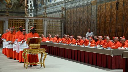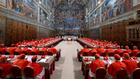 IMAGE: Cardinals pray in the Sistine Chapel ahead of the conclave to elect the next pope at the Vatican. Photograph: Vatican Media/Reuters