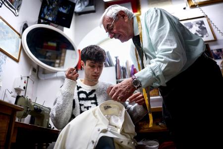 IMAGE: Clerical robe tailor Raniero Mancinelli and his nephew Lorenzo Di Toro work on one of the three white Pope cassocks they have created, to be delivered to the Vatican, at Mancinelli's liturgical vestments shop near the Vatican. Photograph: Guglielmo Mangiapane/Reuters