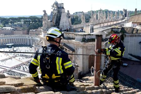 IMAGE: Firefighters install a chimney on the roof of the Sistine Chapel, ahead of the conclave.