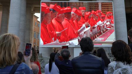 IMAGE: People gathered in St Peter's Square watch a screen showing cardinals in the Sistine Chapel, on the first day of the conclave to elect the new pope. Photograph: Amanda Perobelli/Reuters
