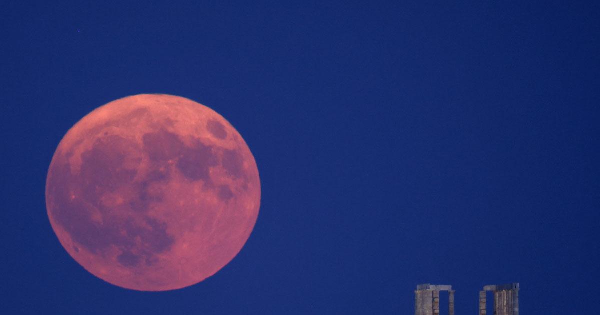 IMAGE: The Super Moon rises next to the Temple of Poseidon on Cape Sounion near Athens, Greece. Photograph: Louiza Vradi/Reuters