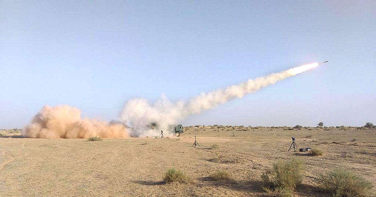 IMAGE: The Defence Research and Development Organisation and the Indian Army successfully flight-tested the Pinaka Mk-I enhanced rocket system and the Pinaka area denial munition rocket systems in Pokharan, Rajasthan. Photograph: PTI Photo