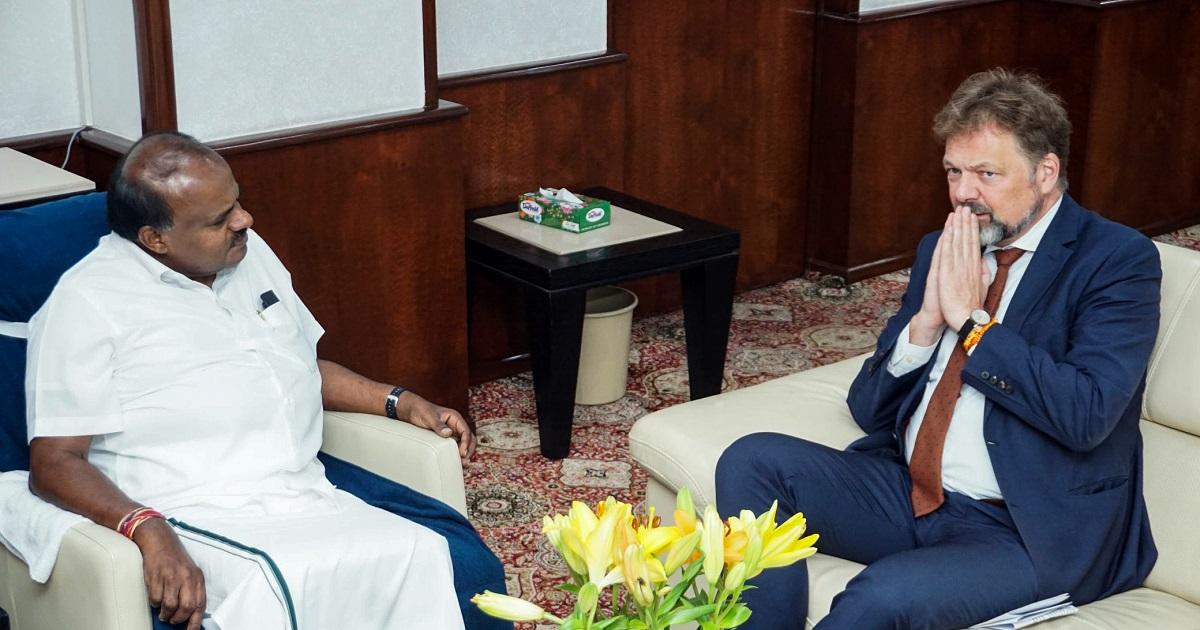 IMAGE: Union Minister for Heavy Industries and Steel HD Kumaraswamy meets with German ambassador to India and Bhutan Philipp Ackermann (right), in New Delhi, July 19, 2024. Photograph: ANI Photo