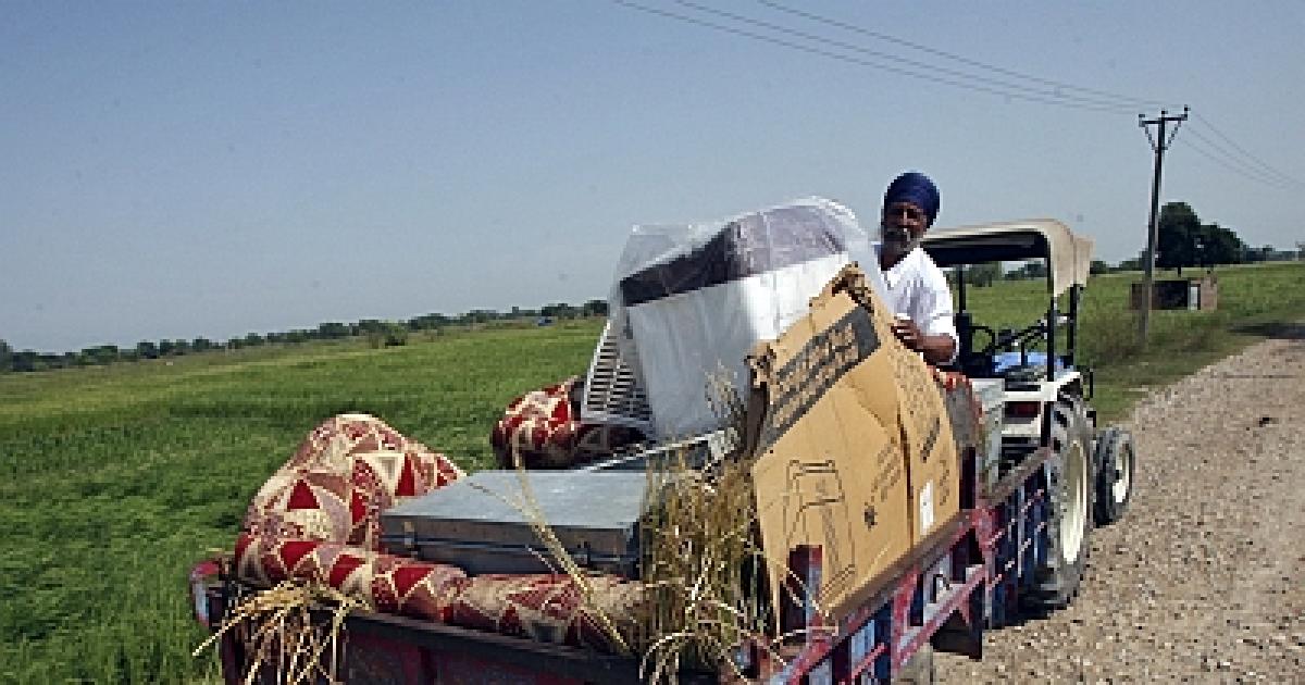 Image: A man with his belongings on a tractor cart moves to a safer place at Jagowal village near Jammu. Photograph: Mukesh Gupta/Reuters