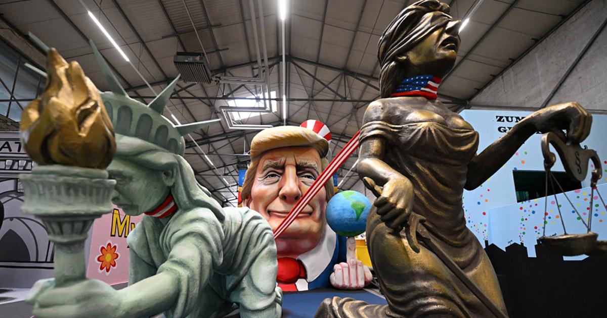 IMAGE: A carnival float depicting US President Donald Trump holding the Statue of Liberty and Lady Justice on a leash is presented ahead of the Rose Monday Carnival parade in Cologne, February 25, 2025. Photograph: Jana Rodenbusch/Reuters
