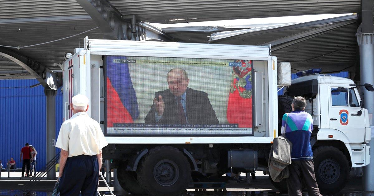 IMAGE: Russian President Vladimir Putin seen on a screen broadcasting Russian television news programmes at a humanitarian aid distribution point in the southern Ukrainian port city of Mariupol, which is now under Russian control. Photograph: Alexander Ermochenko/Reuters