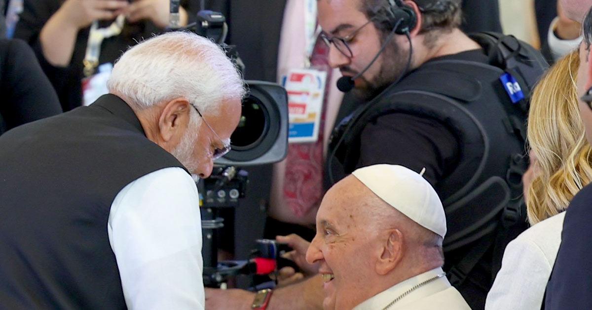Prime Minister Narendra D Modi gave Pope Francis his trademark hug when the Indian leader encountered the head of the Catholic church on the sidelines of the G7 summit at the Borgo Egnazia resort in Savelletri, Italy, June 14, 2024.