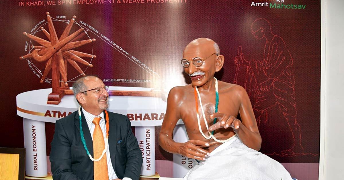 Ambassador Salas sits alongside a model of Mahatma Gandhi during his visit to the Khadi India Pavilion at the India International Trade Fair 2021 in New Delhi, November 25, 2021.