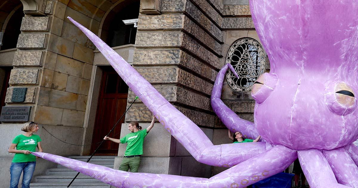 Greenpeace activists staged a protest demanding an end to deep sea mining outside the ministry of industry in Prague, Czech Republic, last week.