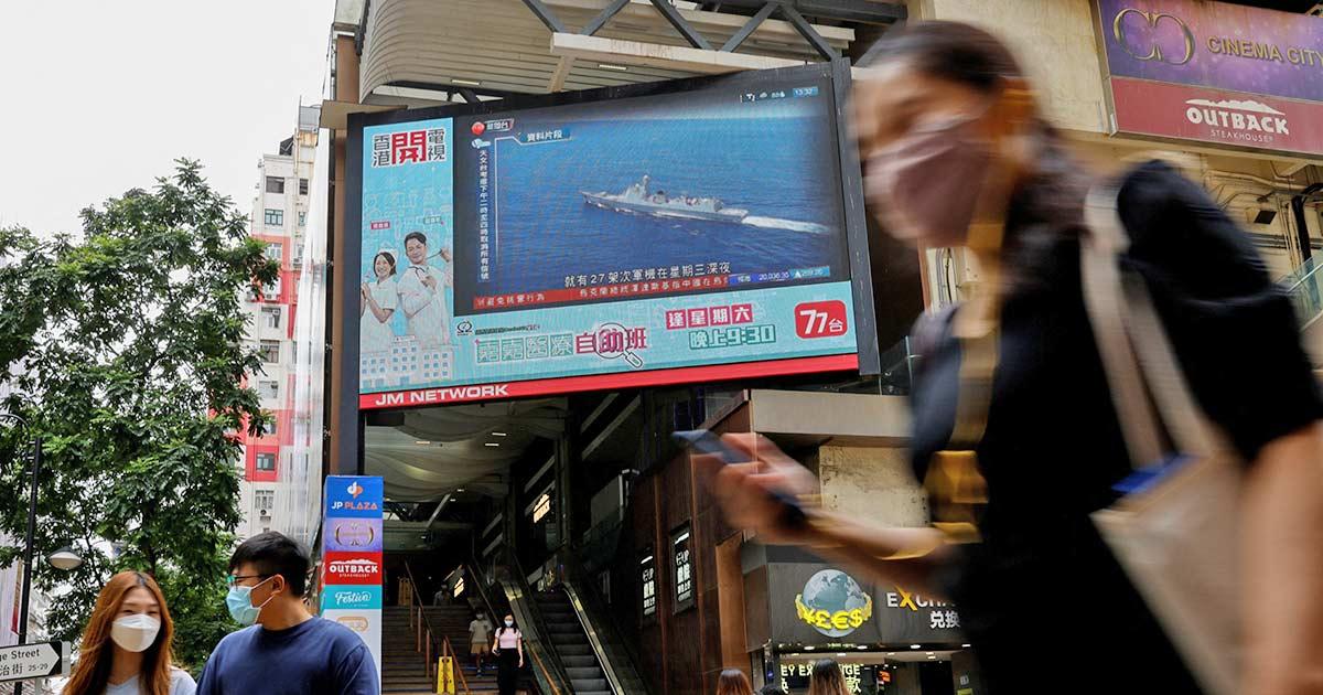 IMAGE: A television screen in Hong Kong reveals that the PLA has begun military exercises including live firing in the waters and airspace surrounding Taiwan. Photograph: Tyrone Siu/Reuters