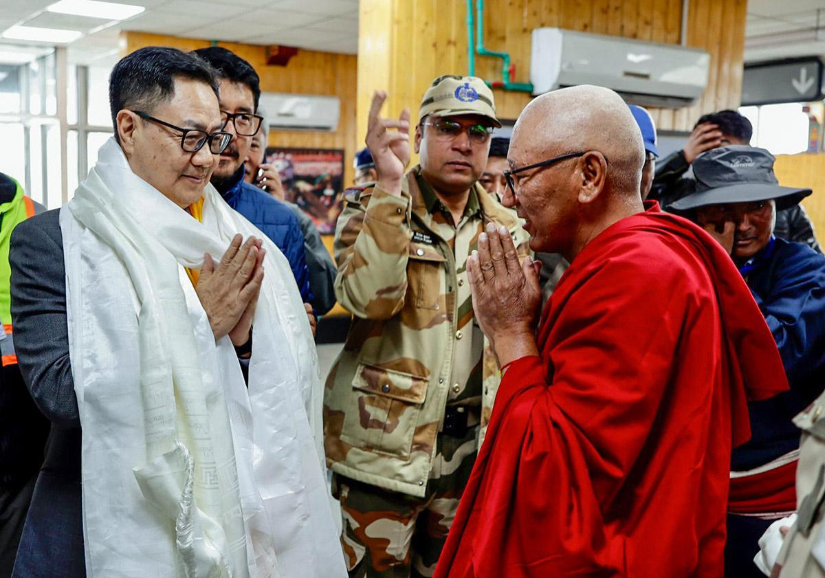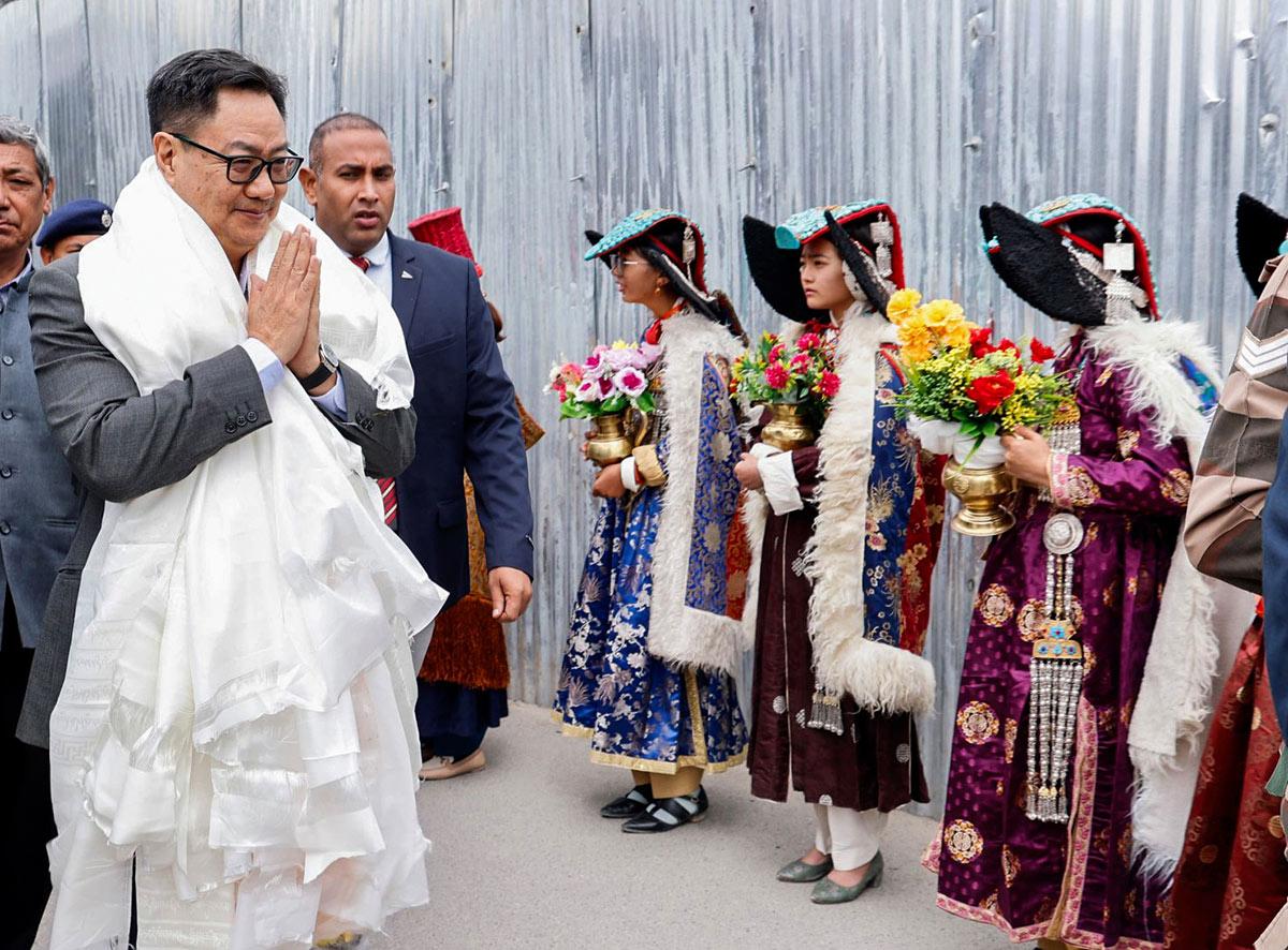 IMAGE: Rijiju receives a warm welcome on his arrival at the Kushok Bakula Rinpoche airport in Leh, here and below.