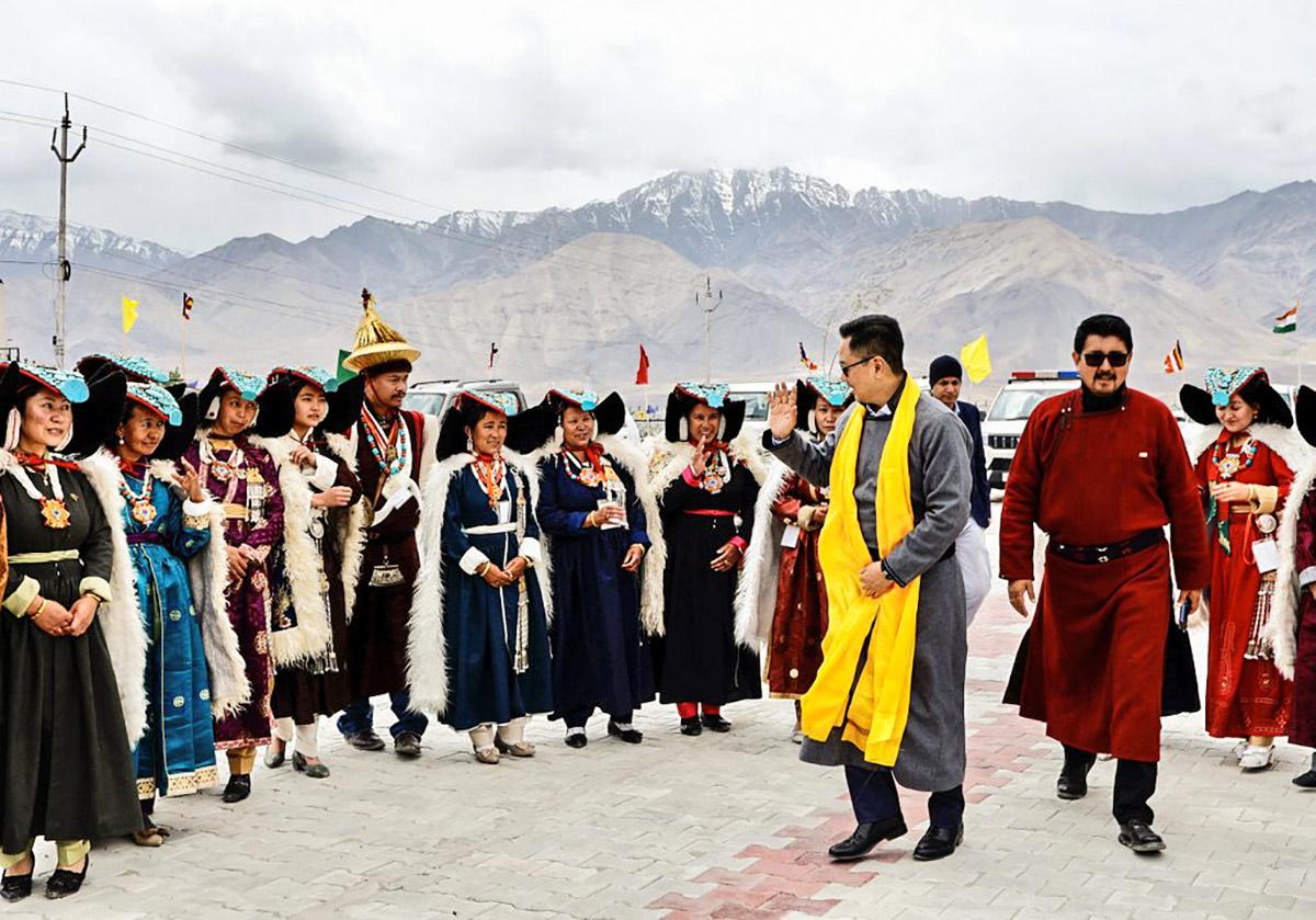 IMAGE: Rijiju receives a warm welcome on his arrival at the Kushok Bakula Rinpoche airport in Leh, here and below.