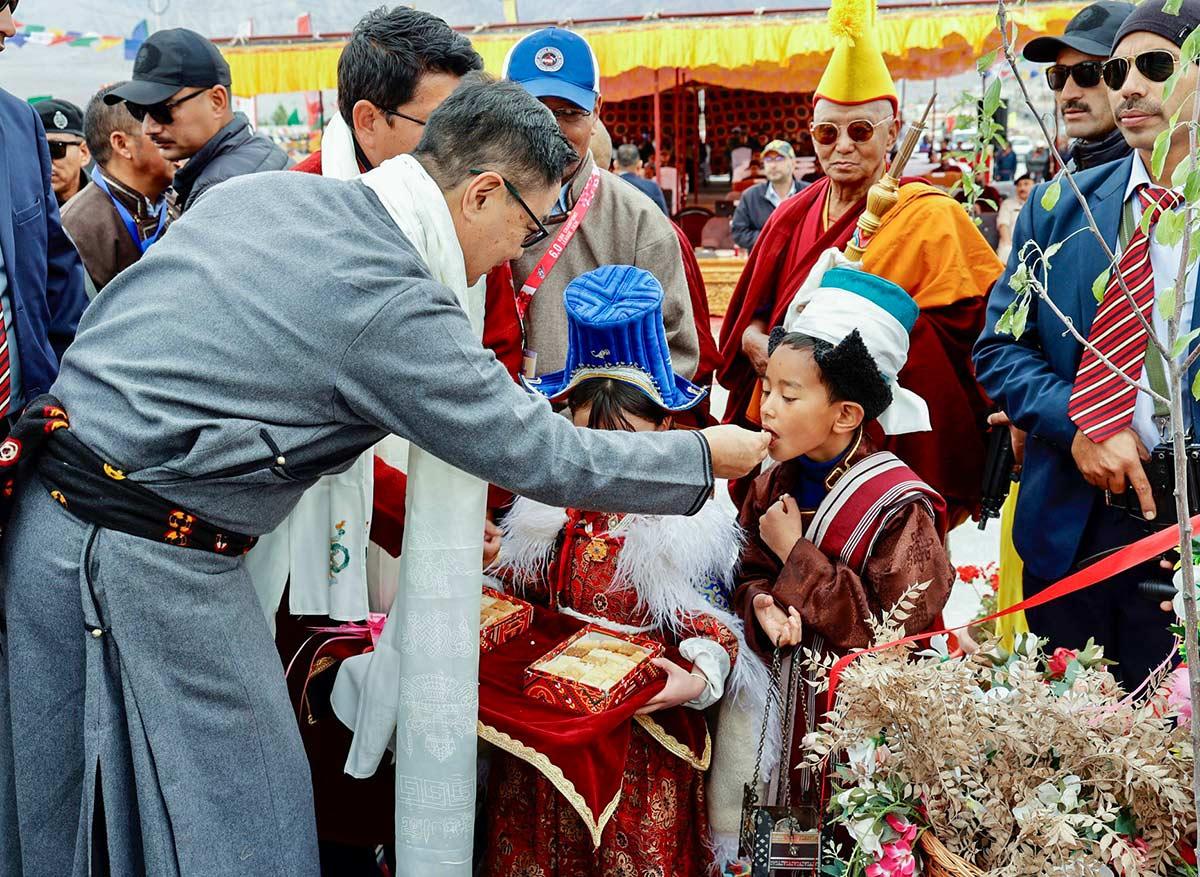 IMAGE: Rijiju offers sweets to a child during the ceremony.