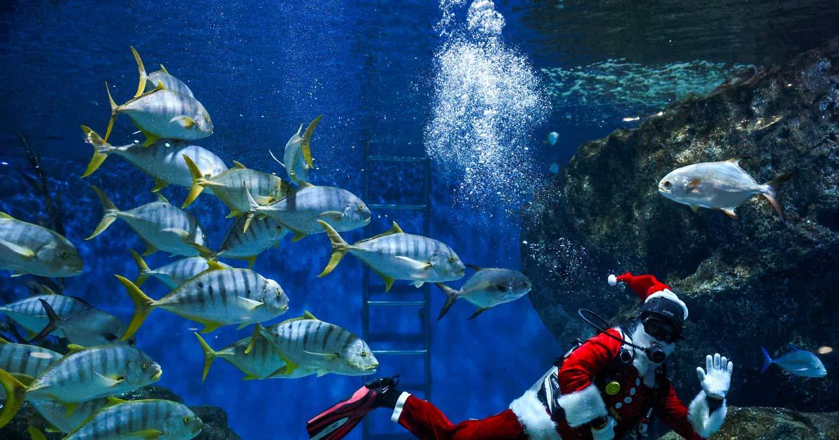 An aquarium in Bangkok celebrates Christmas by holding special shows where divers dress up in Santa Claus costumes to feed the fish.