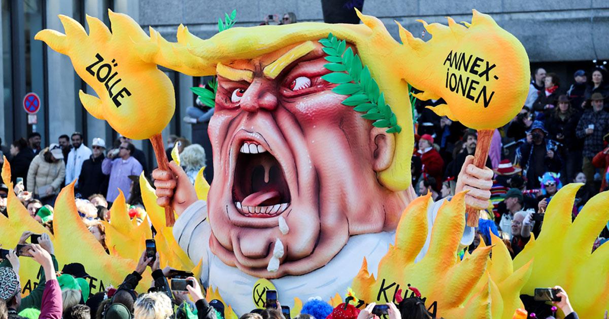 IMAGE: A carnival float by artist Jacques Tilly depicts Vladimir Putin, Volodymyr Zelenskyy and Donald Trump.