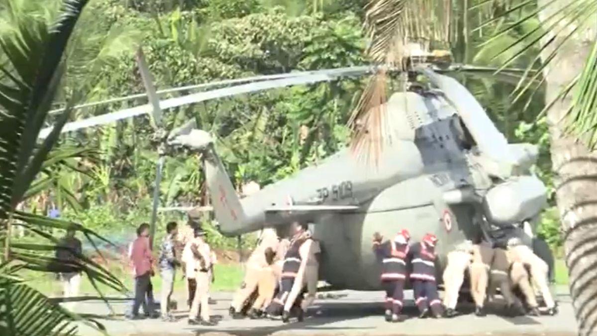 After the President left for Pamba by road, visuals on TV channels showed several policemen and fire force personnel pushing the helicopter's wheels out of the small depressions created when it landed on the concrete.