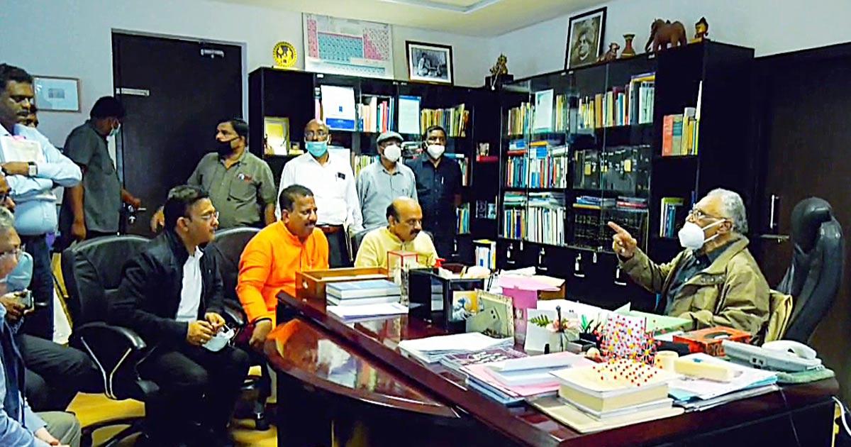 IMAGE: Bharat Ratna Professor Chintamani Nagesa Ramachandra Rao interacts with Karnataka Chief Minister Basavaraj Bommai, November 23, 2021, at the Jawaharlal Nehru Centre for Advanced Scientific Research in Bengaluru, where more than 780 computers were damaged due to waterlogging.