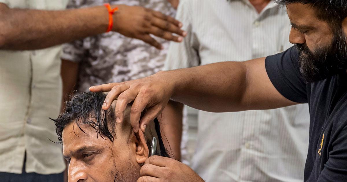 Samajwadi Party President Akhilesh Yadav shaved his head to perform the post-death rituals for his father Mulayam Singh Yadav at Saifai, in Etawah, Uttar Pradesh, on Wednesday October 12, 2022.