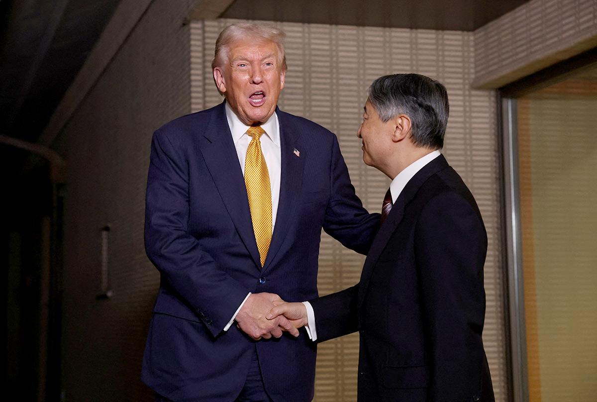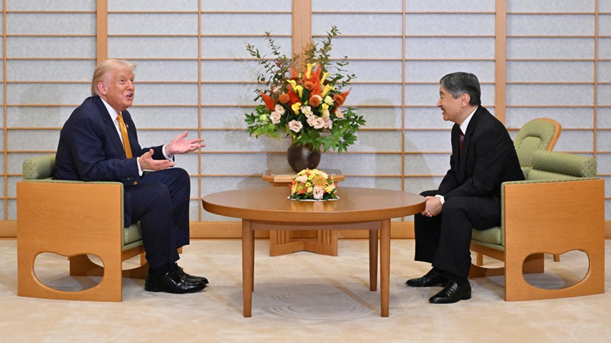 IMAGE: Emperor Naruhito escorts Trump at the Imperial Palace. Photograph: Kazuhiro Nogi/Pool via Reuters