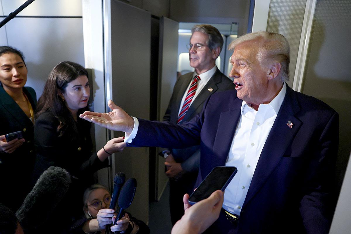 IMAGE: Earlier, Trump speaks to reporters as US Treasury Secretary Scott Bessent stands next to him aboard Air Force One en route to Tokyo. Photograph: Evelyn Hockstein/Reuters