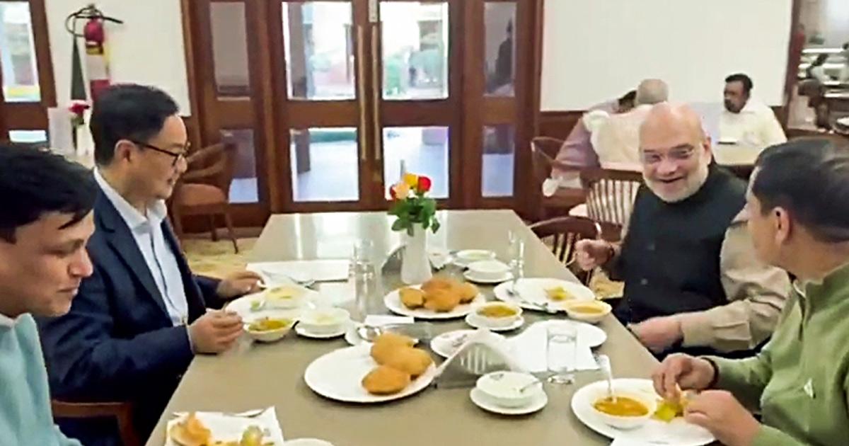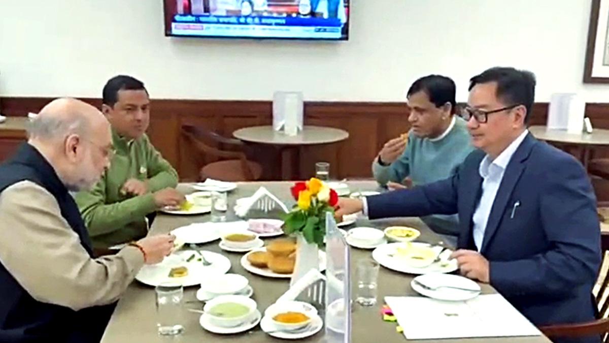 IMAGE: Amitbhai's lunch companions included Union Minister Kiren Rijiju, Union Minister of State for Home Nityanand Rai (who could replace Nitish Kumar when he steps down as Bihar chief minister) and Anil Baluni, the BJP MP from Uttarkhand. Photographs: Video Grab/ANI Photo