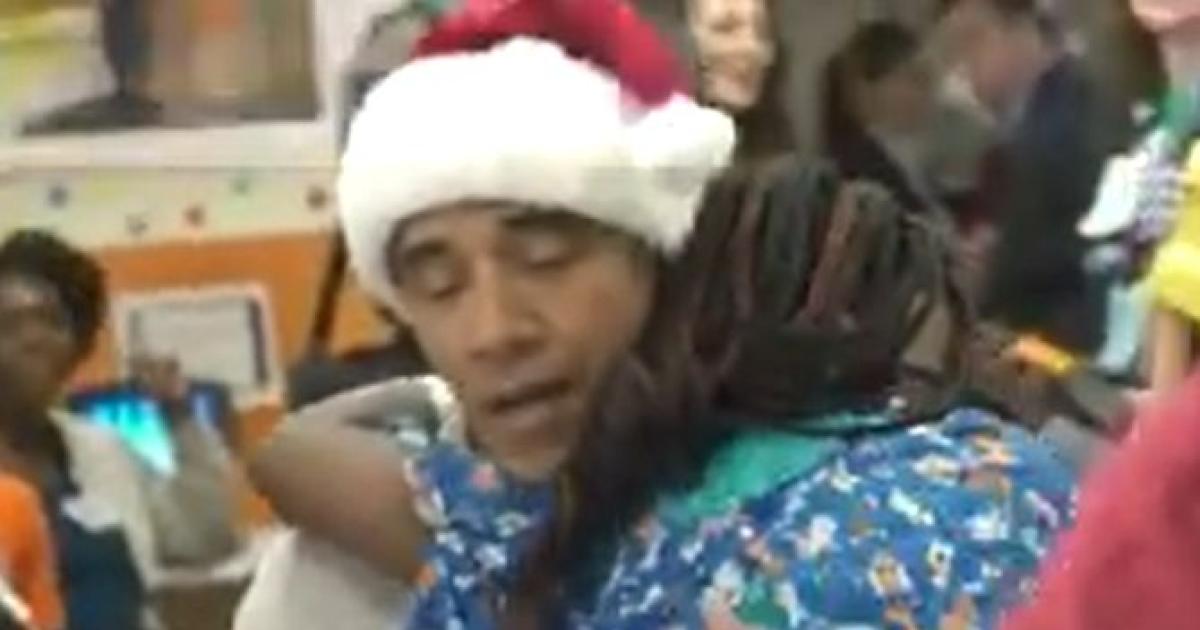 Barack Obama, donning a Santa Claus hat and a bulging sack slung over his shoulder, made a surprise visit to a children's hospital in Washington, DC and delivered gifts to young patients ahead of Christmas.