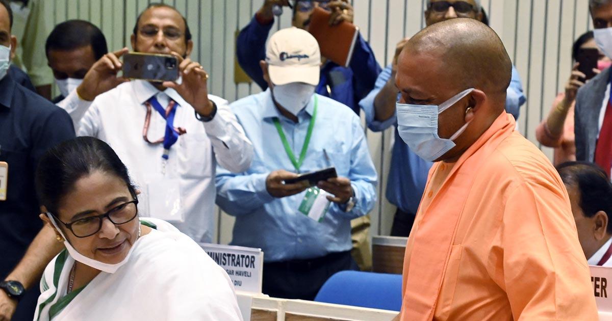 What did Mamata and Yogi, who were seated one seat away from each other (chief ministers were alloted positions according to the names of their states), say to each other, we wonder. Photograph: Sanjay Sharma/ANI Photo