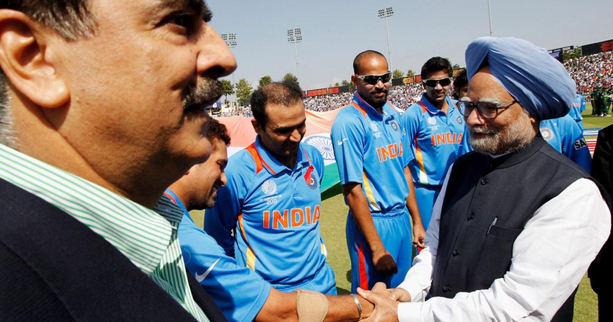IMAGE: Dr Manmohan Singh, then prime minister of India, wishes Sachin Tendulkar all the best as Pakistan's then prime minister Yousaf Raza Gilani, left, looks on, before the start of the World Cup semi-final match between India and Pakistan at the Punjab Cricket Association Stadium in Mohali, March 30, 2011. Photograph: Daniel Berehulak/Pool/Reuters