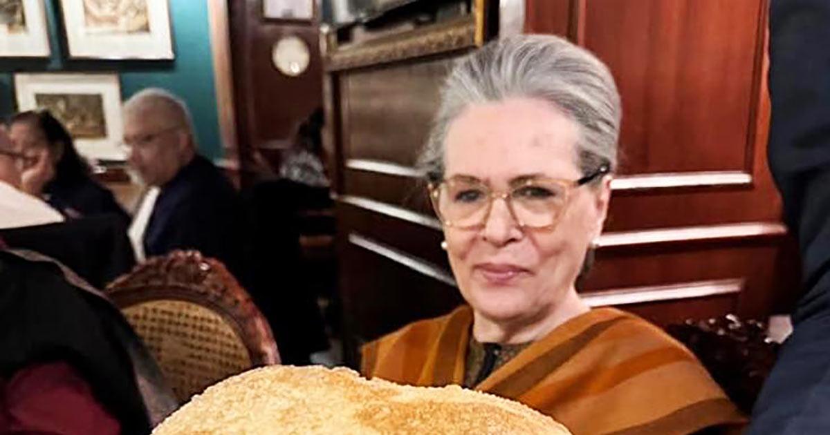 IMAGE: 56 years after she married into the Nehru family Soniaji still appears amazed at the size of the Bhatura. Photographs: ANI Photo