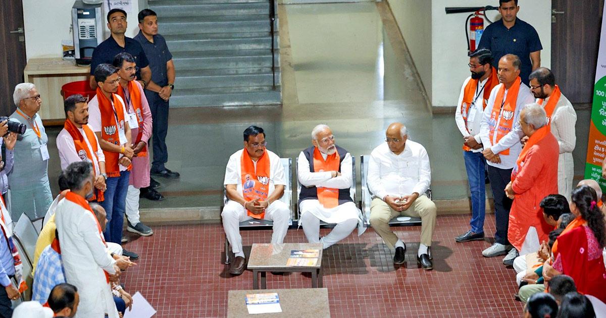 IMAGE: Senior Bharatiya Janata Party leader Narendra D Modi with Gujarat BJP leaders Bhupendra Patel and C R Paatil at Kamalam, the state party headquarters. Photograph: Kind courtesy @narendramodi/X