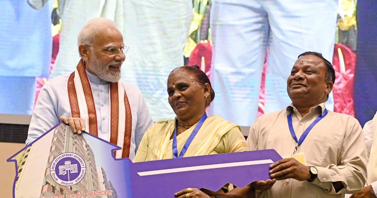 IMAGE: There was not a dry eye in sight as 3,024 beneficiaries of a slum rehabilitation project were overwhelmed by emotion as Prime Minister Narendra Damodardas Modi handed them the keys to their new homes at Vigyan Bhawan in New Delhi. All photographs: ANI Photo
