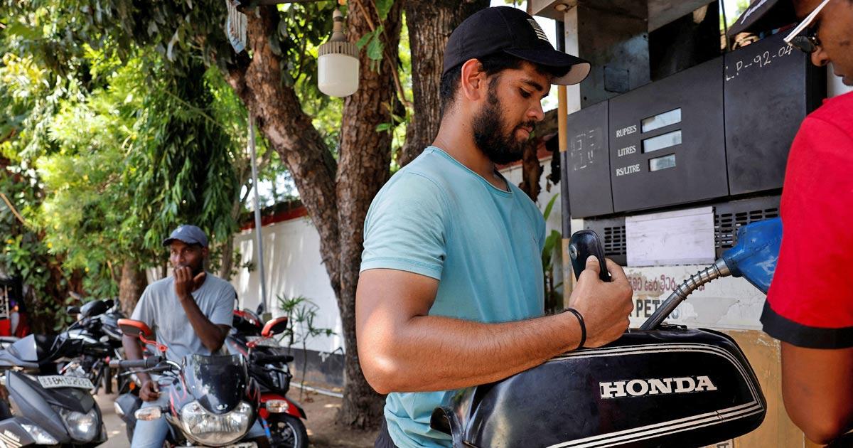 IMAGE: A man refills the fuel tank of his Honda motor bike which was stuck after it ran out of fuel. All Photographs: Dinuka Liyanawatte/Reuters