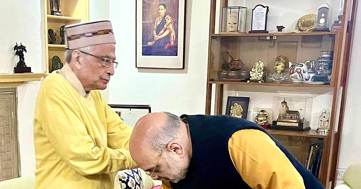IMAGE: Home Minister Amit A Shah seeks Bharatiya Janata Party veteran Murli Manohar Joshi's blessing.