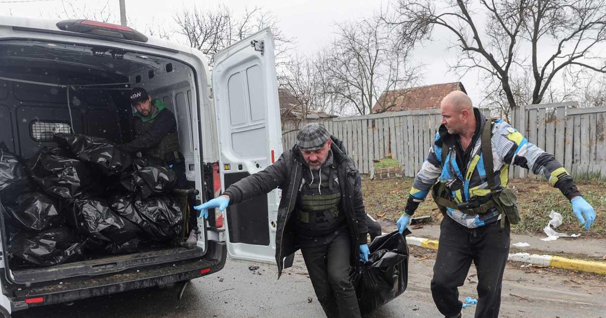 IMAGE: Volunteers prepare to put the body of a civilian, who according to residents was killed by Russian soldiers, in a van carrying body bags in Bucha in the Kyiv region.