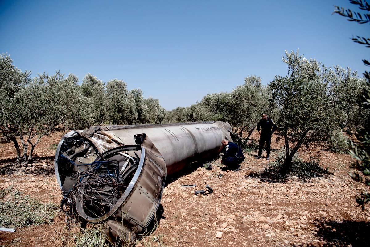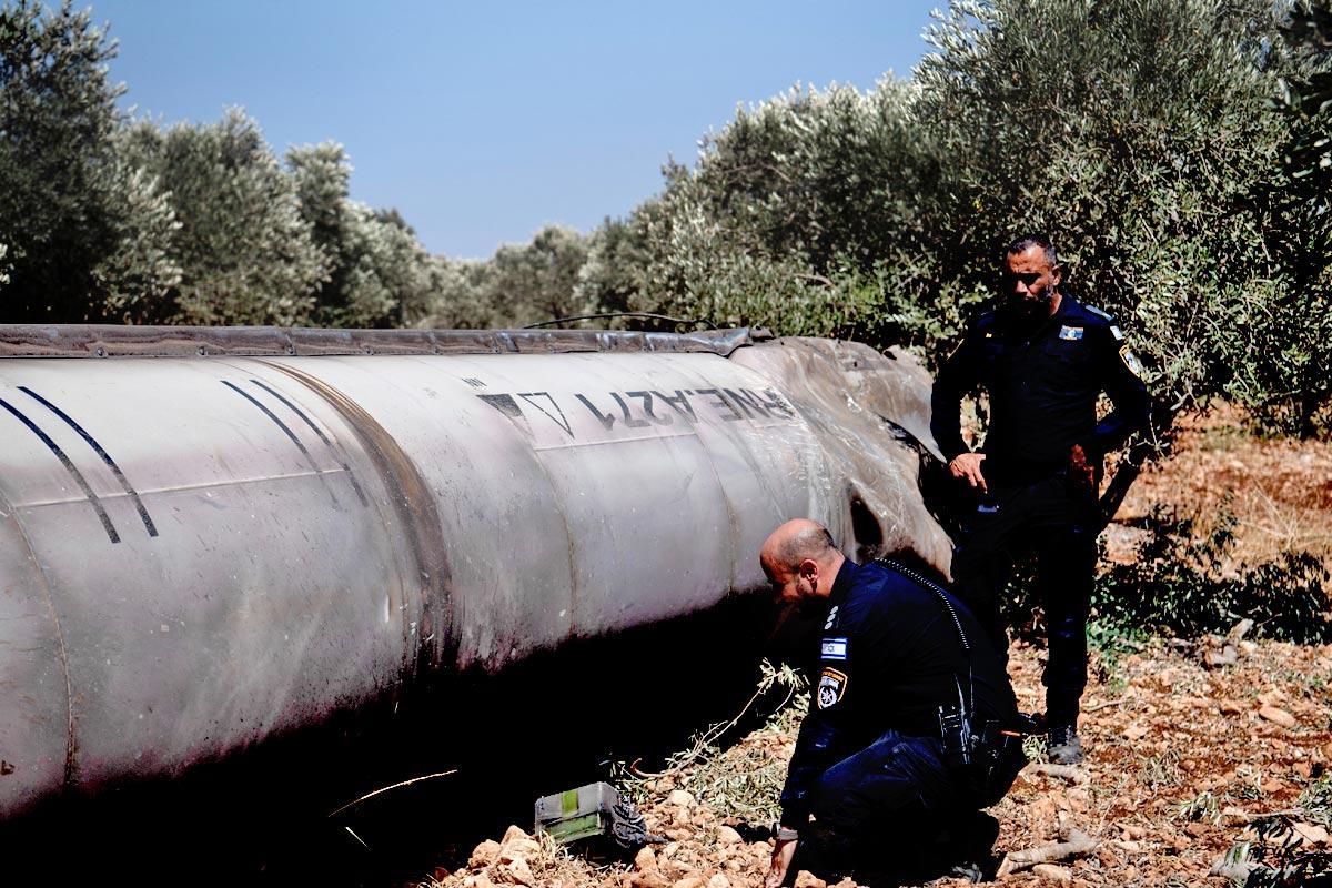 IMAGE: Members of the Israeli police check the apparent remains of a ballistic missile. Photograph: Gil Eliyahu/Reuters