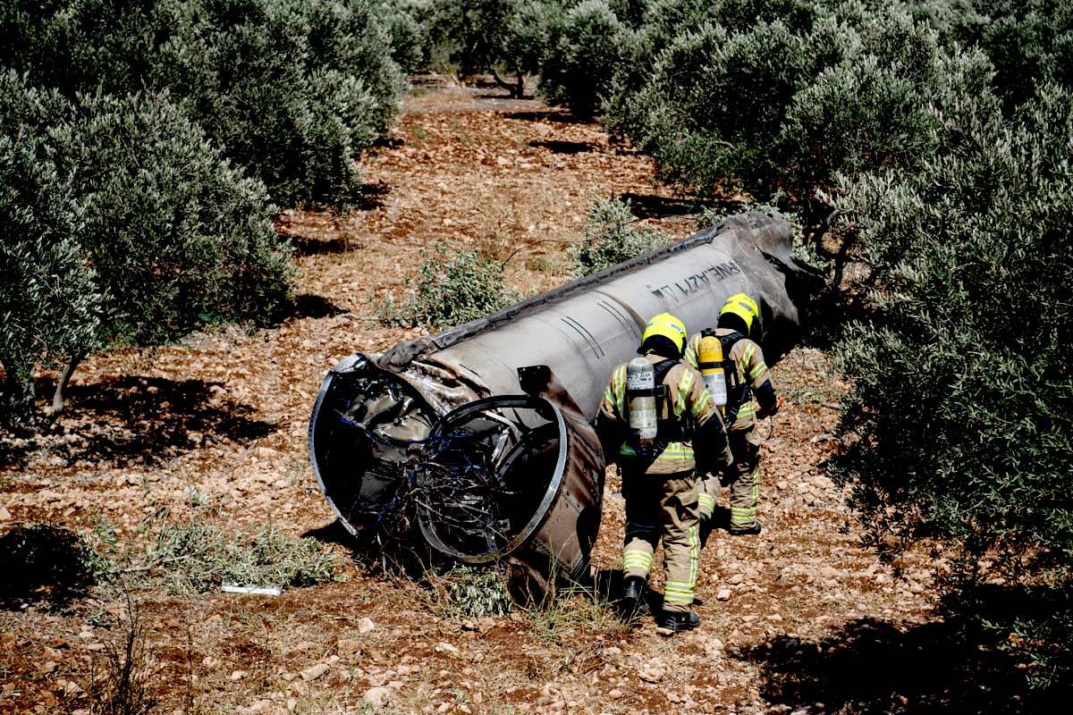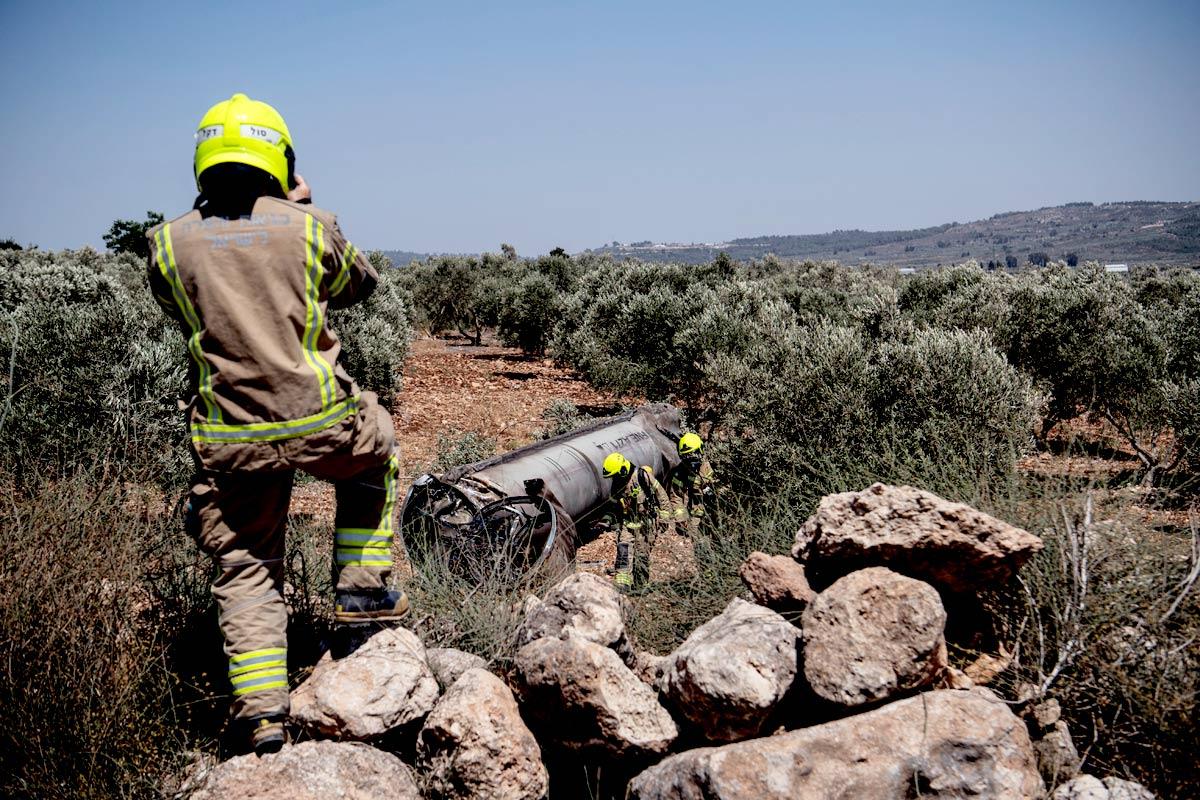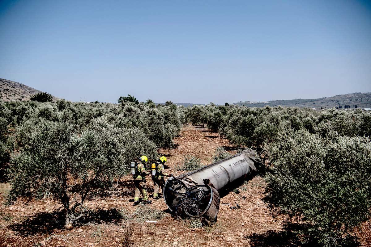 IMAGE: Members of the Israeli police check the apparent remains of a ballistic missile lying on the ground in northern Israel before being evacuated from the location where they were found, following missile attacks by Iran on Israel. Photograph: Gil Eliyahu/Reuters
