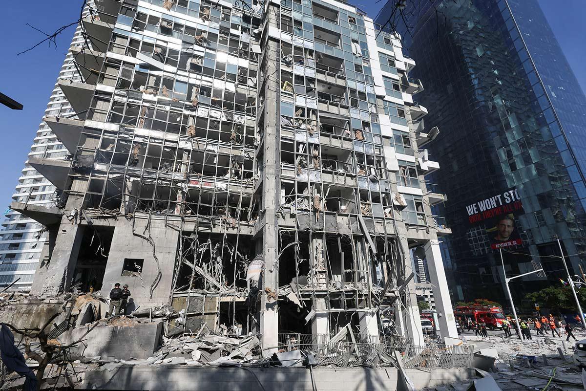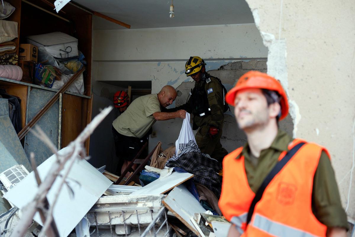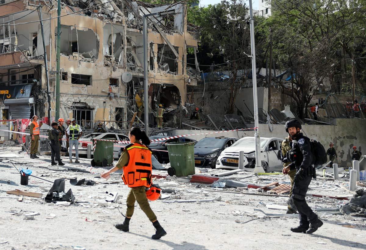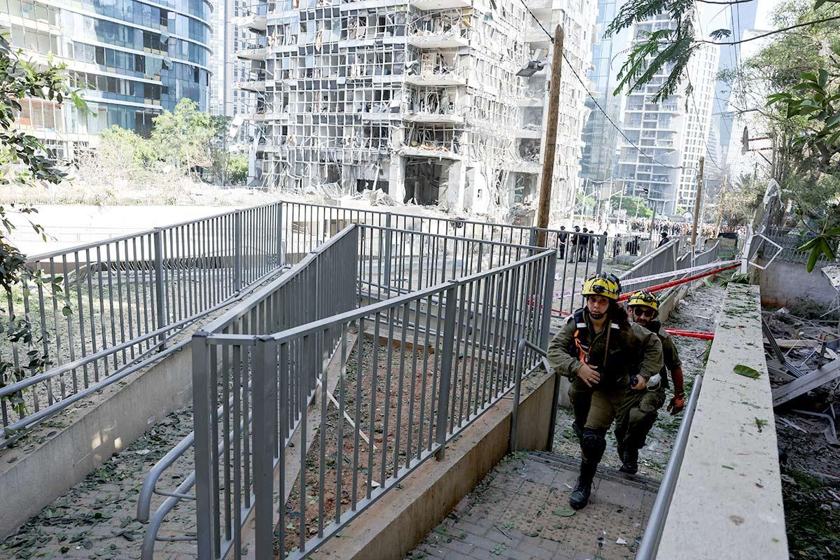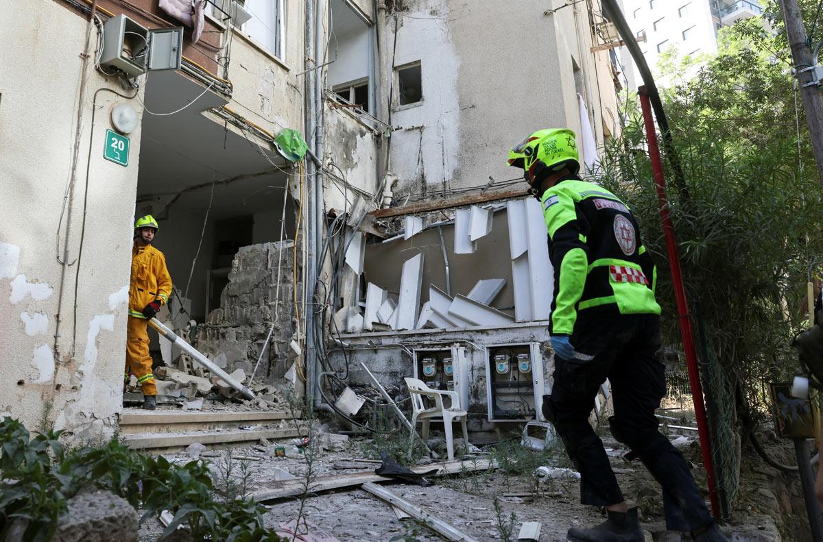 IMAGE: Emergency personnel work at an impact site in Holon, Tel Aviv. Photograph: Violeta Santos Moura/Reuters