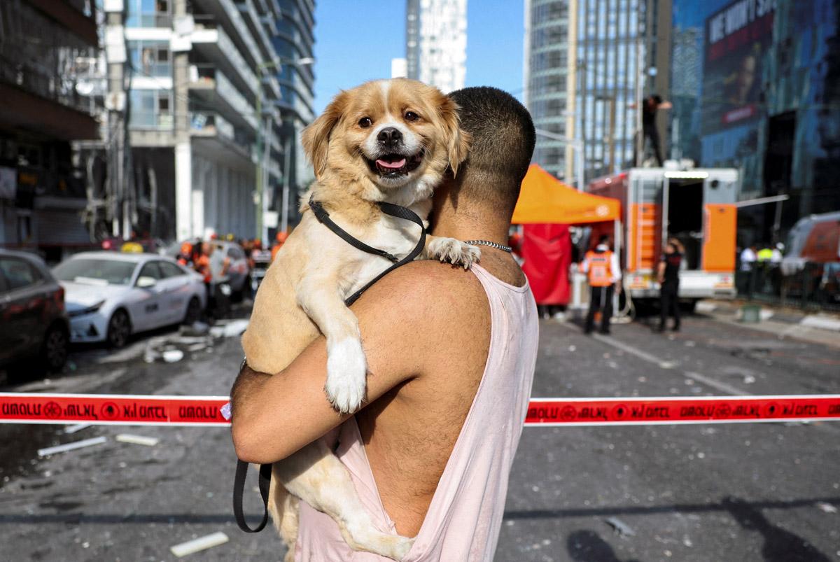 IMAGE: A person carries his dog at an impact site. Photograph: Nir Elias/Reuters