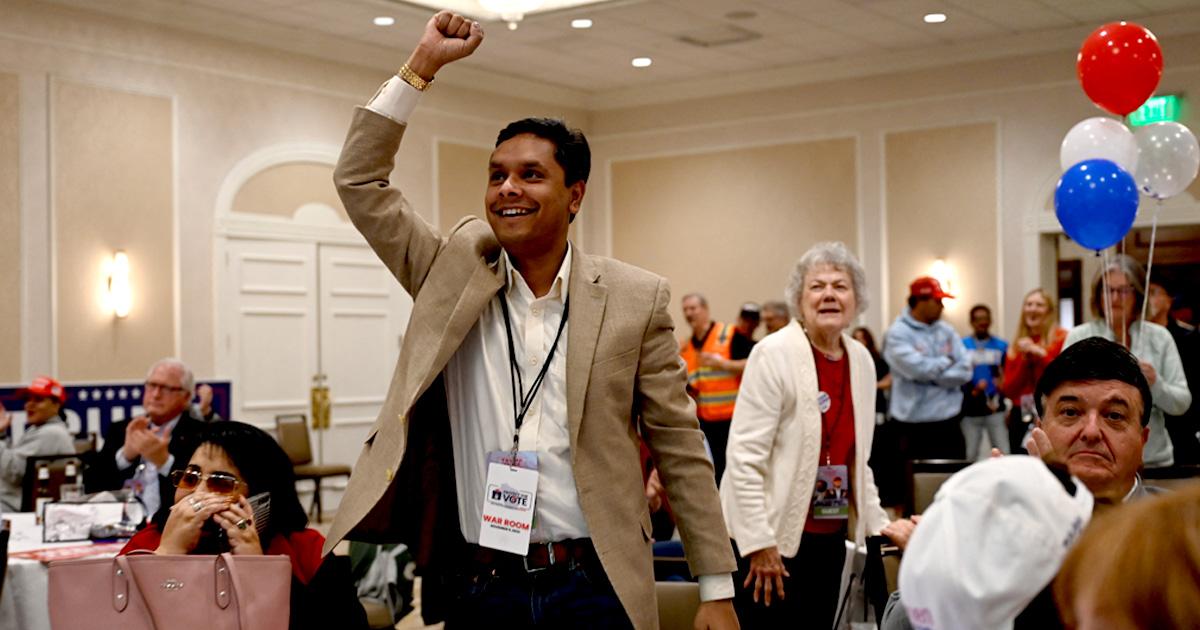 IMAGE: What appears to be an Indian American supporter during a Republican election night watch party at the Ingleside Hotel in Pewaukee, Wisconsin. Photograph: Vincent Alban/Reuters