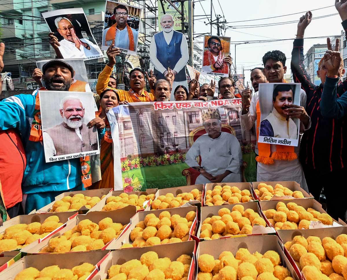 IMAGE: BJP supporters in Patna on Sunday offer sweets to celebrate the NDA's massive victory, here and below. Photograph: ANI Photo