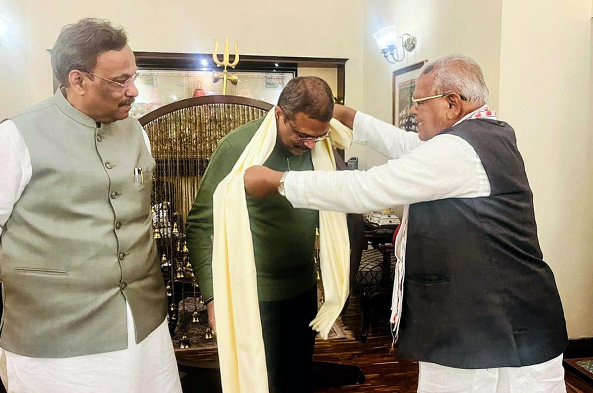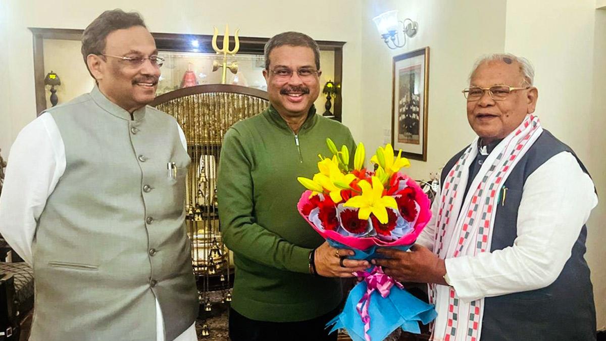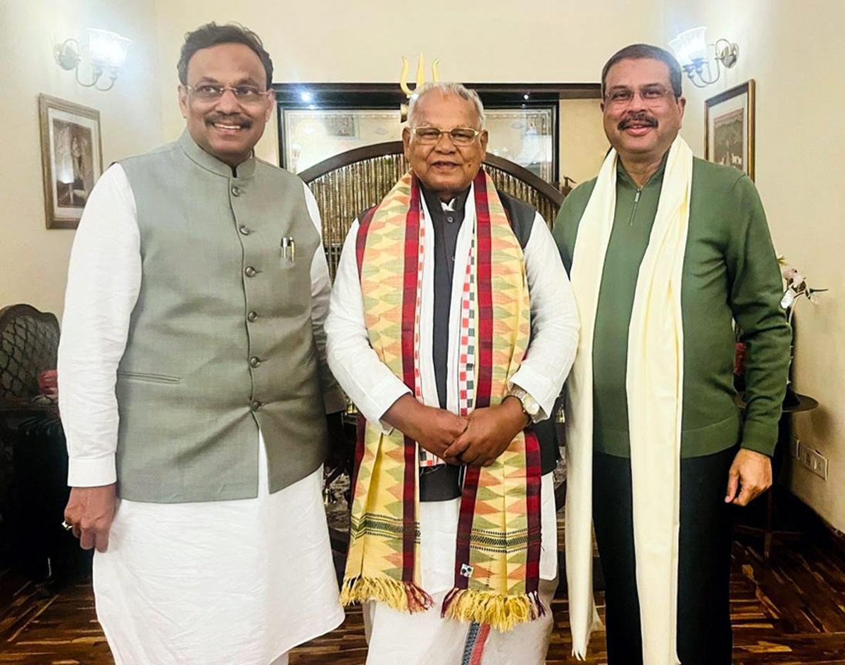 IMAGE: Union Minister and Hindustani Awam Morcha leader Jitan Ram Manjhi felicitates Union Minister and BJP Bihar election in-charge Dharmendra Pradhan in New Delhi on Sunday on the NDA's victory, here and below. Photograph: Office of Jitan Ram Manjhi/ANI Photo