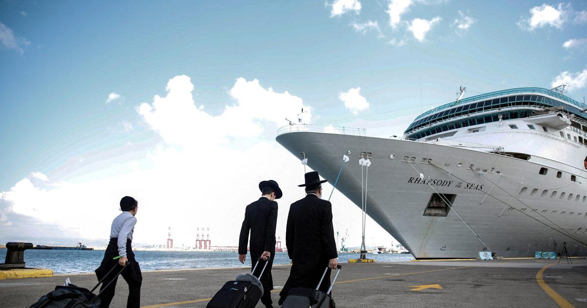 IMAGE: Ultra-Orthodox Jewish men carry their belongings before boarding a ship in Haifa for US nationals and their immediate family members as they leave Israel headed for Cyprus. Photograph: Shir Torem/Reuters