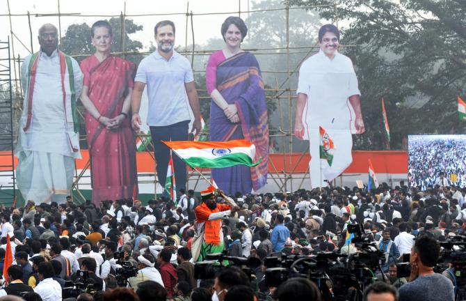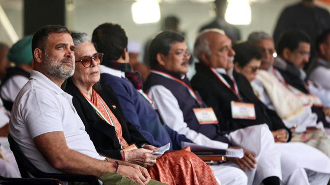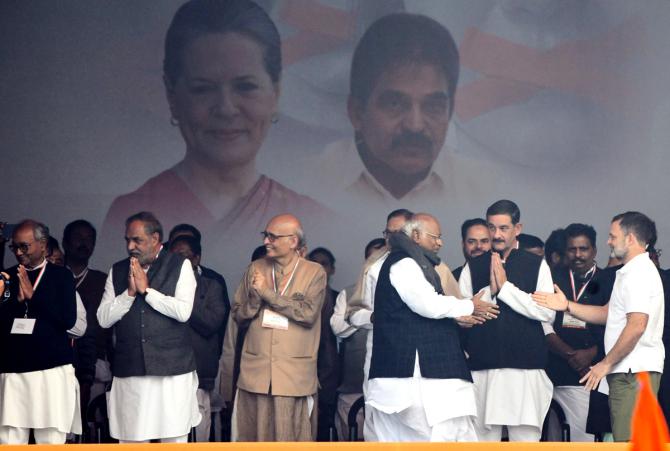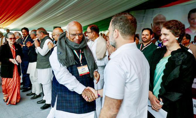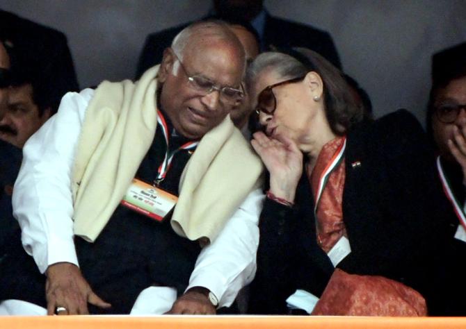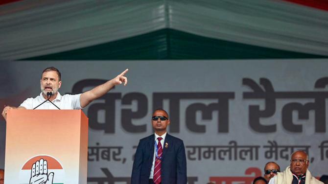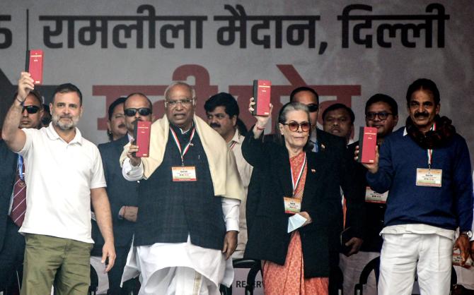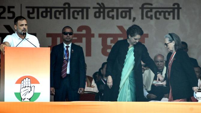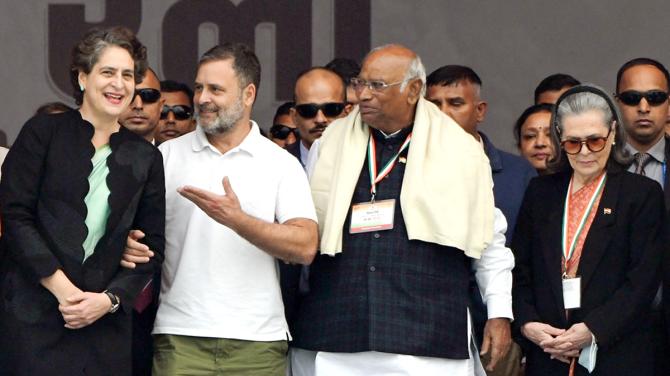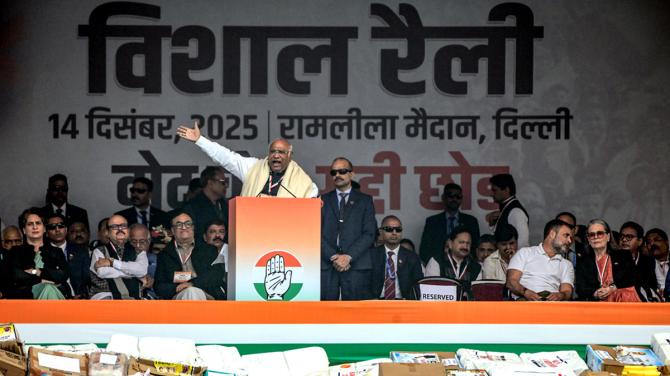 IMAGE: Congress President Mallikarjun Kharge speaks at the Congress rally against 'Vote Chori' as Congress Parliamentary Party Chairperson Sonia Gandhi, Congress General Secretary Priyanka Gandhi, Congress Treasurer Ajay Maken, Rahul Gandhi, Tariq Anwar and other Congress leaders look on. Photograph: Naveen Sharma/ANI Photo