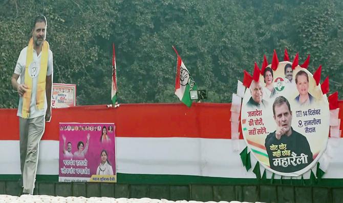 IMAGE: A banner and cut out of Rahul Gandhi and other Congress leaders at the Ramlila Maidan for the 'Vote Chori' rally. Photograph: ANI Video Grab