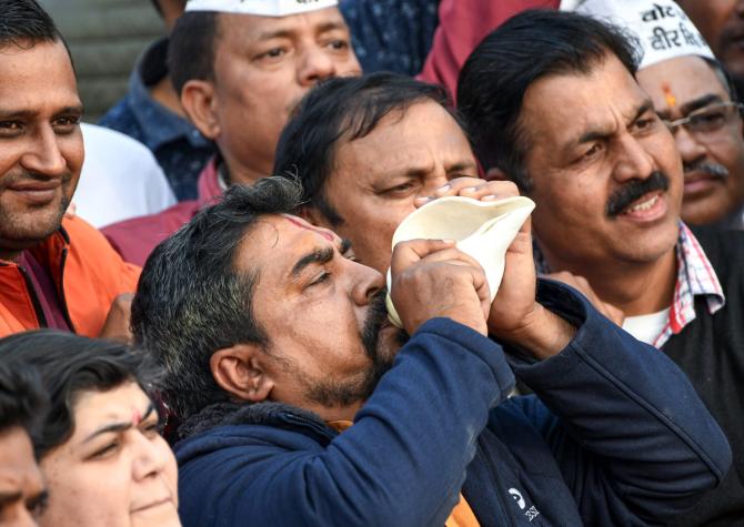 IMAGE: A man blows a shell during during the 'Vote Chori' rally. Photograph: Naveen Sharma/ANI Photo