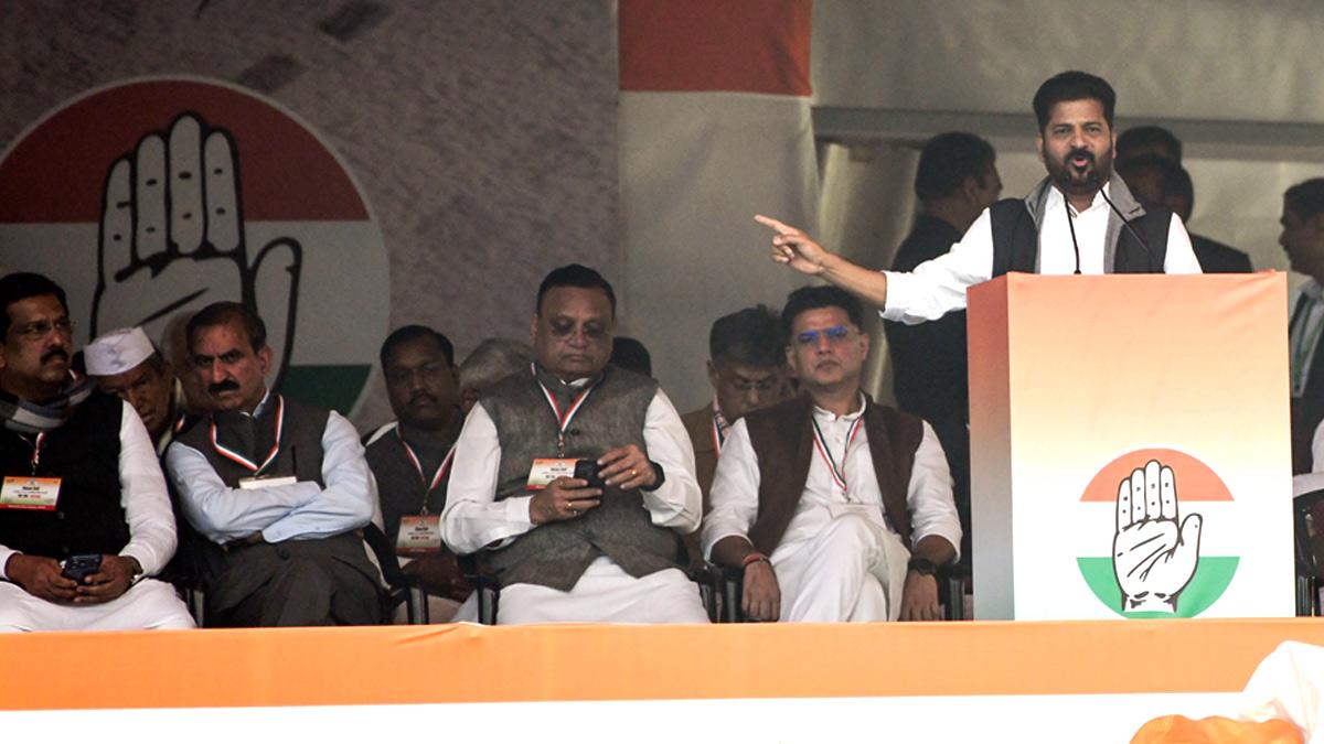IMAGE: A day after he played a game of football alongside Lionel Messi, Telangana Chief Minister A Revanth Reddy spoke at the 'Vote Chori' rally, listened to by Himachal Pradesh Chief Minister Sukhvinder Singh Sukhu, Congress General Secretary Sachin Pilot among others. Photograph: Naveen Sharma/ANI Photo