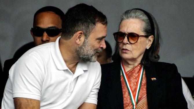 IMAGE: Sonia Gandhi has a word with her son at the 'Vote Chori' rally. Photograph: Naveen Sharma/ANI Photo