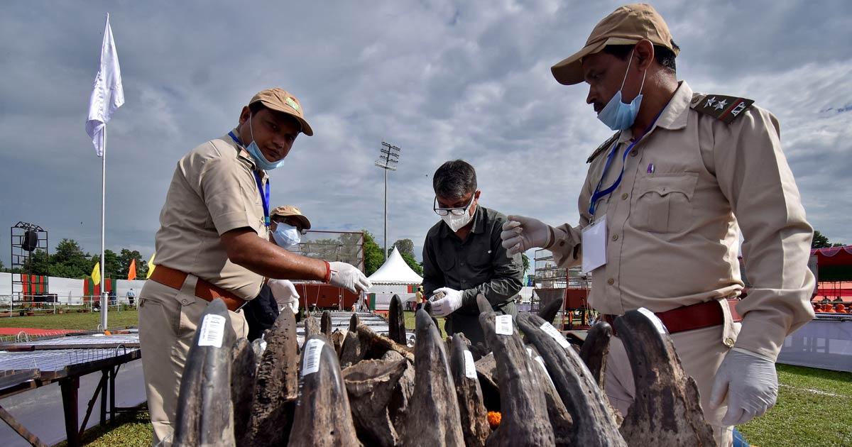 IMAGE: Forest officials arrange seized rhino horns before burning them during an event to mark World Rhino Day in Bokakhat near the Kaziranga National Park in Assam. All Photographs: Anuwar Hazarika/Reuters