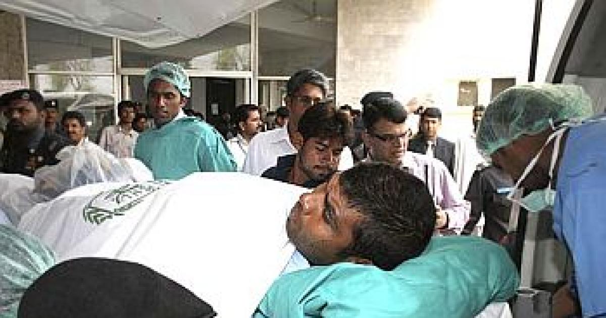 Image: Sri Lankan cricketer Tharanga Paranavitana is carried on a stretcher to a hospital in Lahore after a dozen gunmen attacked their bus near the Gadaffi stadium on March 3, 2009. Photograph: Reuters