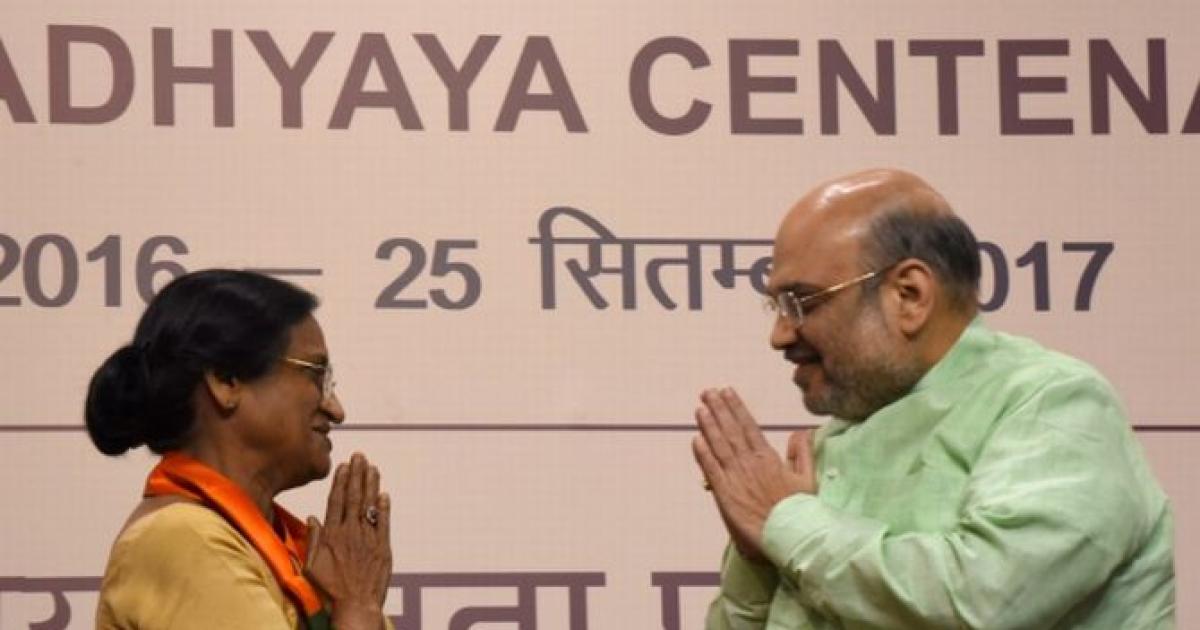 IMAGE: Rita Bahuguna Joshi greets BJP President Amit Shah after joining the party. Photograph: @BJP4India/Twitter